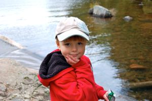 We made it as far as the bridge where Meech Lake empties into Little Meech Lake. The boys were suitably impressed by the clear water and beautiful view, and we spent a bit of time scrambling over the rocks. That was as far as we made it, though – the mill will have to wait for the next hike. On the positive side, the boys did stand still long enough for a few nice photos.