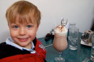 We ended up at a Greek restaurant around the corner for a last breakfast / early lunch. The boys each ordered a chocolate milk and were rewarded with essentially a chocolate milk shake. Although it’s a little blurry, K’s excitement at his good fortune is evident.