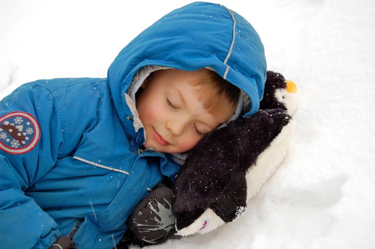 K and I went for a walk with his favourite gift, a penguin pillow pet. Midway through our trek to the RCMP stables he took a break to have a nap on a snowbank (yes, we had a white Christmas after all).