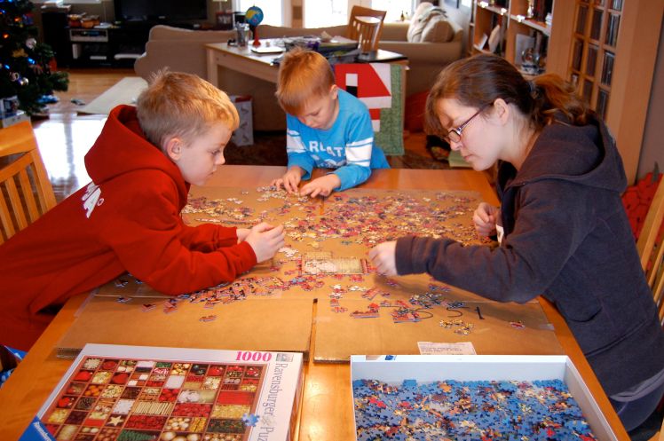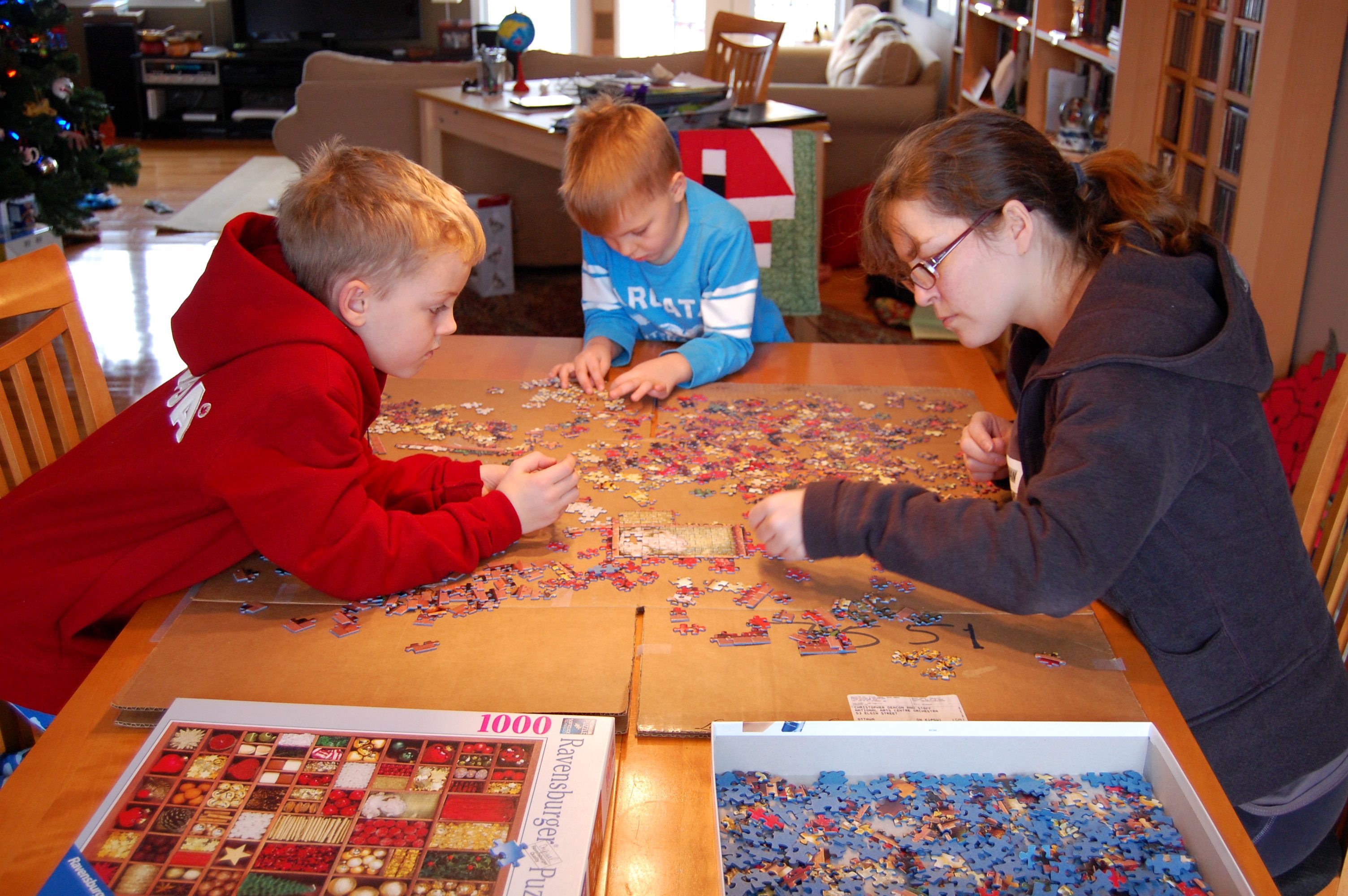B and the boys working on a 1,000-piece puzzle (this scene of familial bliss lasted about 4 minutes in total before A & K went off to play with Lego).