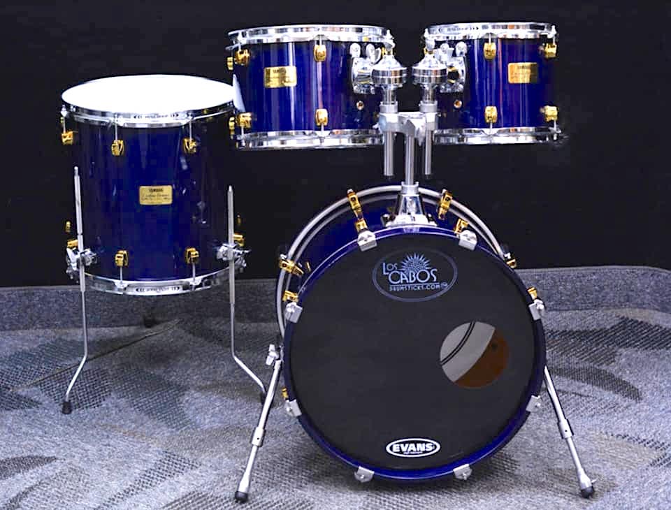 This is a Yamaha Custom kit in Deep Blue finish. For a few years in the 90s, Yamaha had a custom shop where you could choose woods, lugs, sizes to your liking. As a Yamaha endorser, I was lucky enough to get a kit in this finish with 22×18″ birch BD and 10, 12, 15 toms and a 16 floor tom in maple. I still have it and it’s awesome.